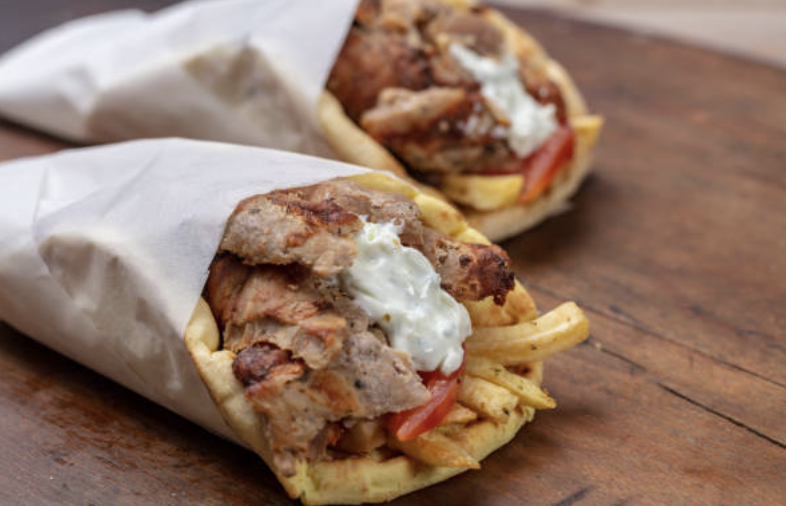 Das beliebteste Street Food Griechenlands. Gyros in luftiger Pita mit Zwiebeln, Tzatziki, Pommes, Tomate.