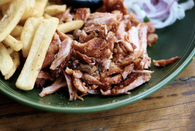 Saftiges Steakfleisch vom Schweinenacken, knusprig gebraten am Drehspieß mit herzhafter Beilage.