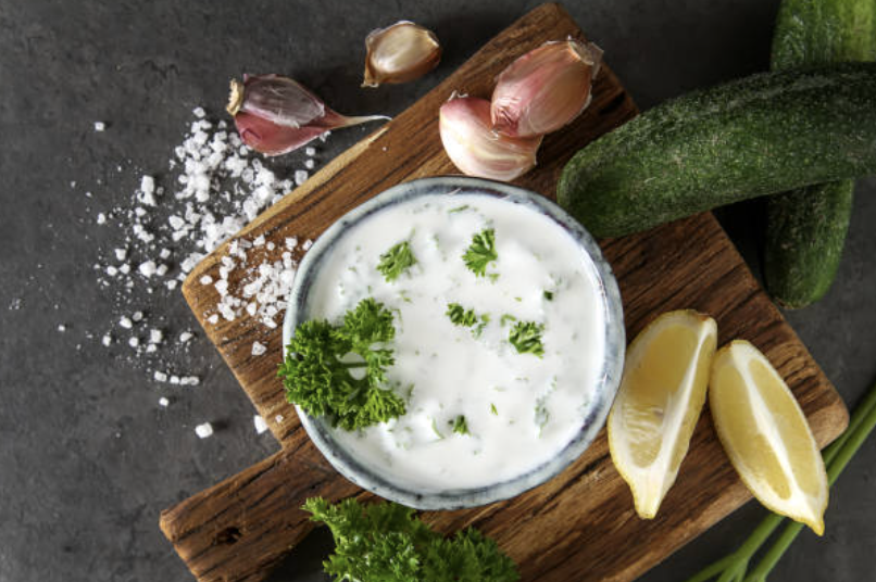 Trditioneller grieschicher Joghurt mit jungem Knoblauch, Gurkenraspeln und Dillspitzen.